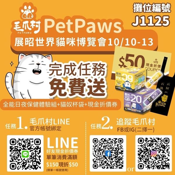 加入吹毛求吃(LINE/FB/IG)三擇一,免費送貓肉泥!