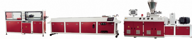 Complete production lines consists of 65mm conical twin screw extruder, pipe extrusion mould, vacuum cooling tank, double haul-off and cutting unit, and stacker.