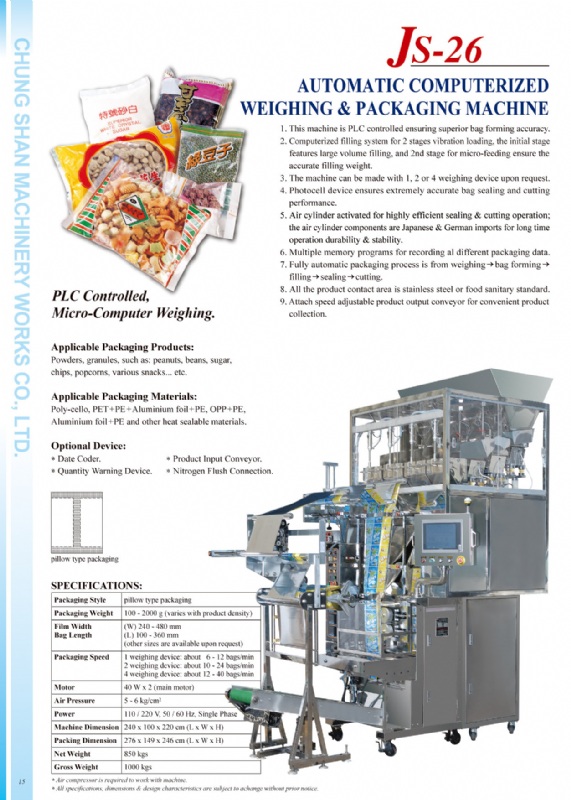-Packing weight, bag length, sealing temperature, vibration, cutting mode (eye mark cutting or length cutting), counter, quantity warning, cutting time, sealing time, memory record …etc., are adjustable on the panel.