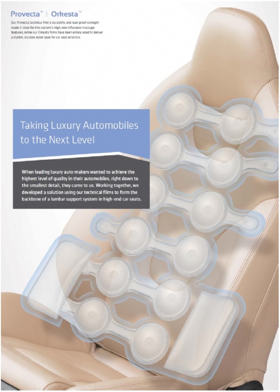 Our Provecta technical film’s durability and leak-proof strength made it ideal for this system’s high-end inflatable massage features, while our Orkesta films have been widely used to deliver a stylish, durable outer layer for car seat exteriors.