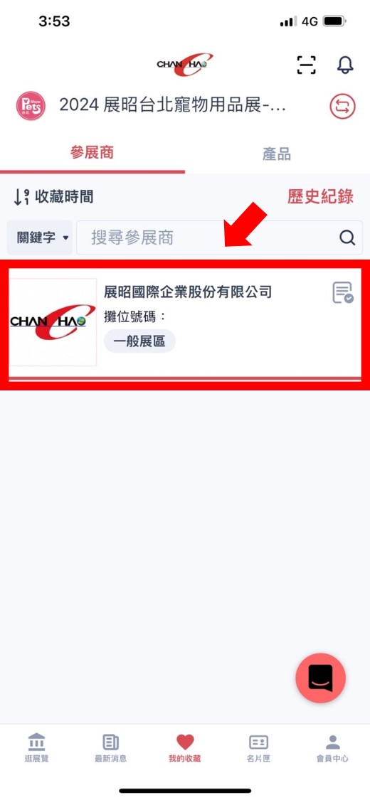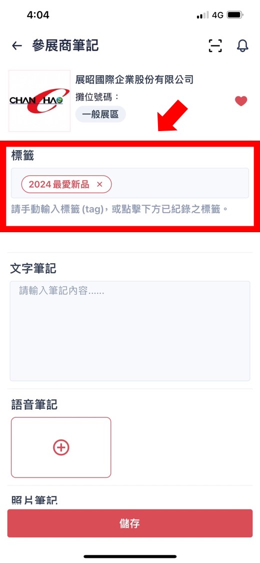 - 進入【展昭展覽APP】>點選下方【我的收藏】>點擊收藏之廠商>於標籤欄位填寫【2024最愛新品】