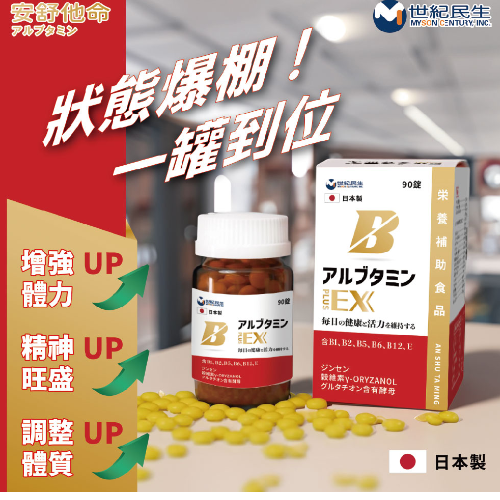 安舒他命EX plus融合了多種維他命B群、人蔘和穀胱甘肽等成分