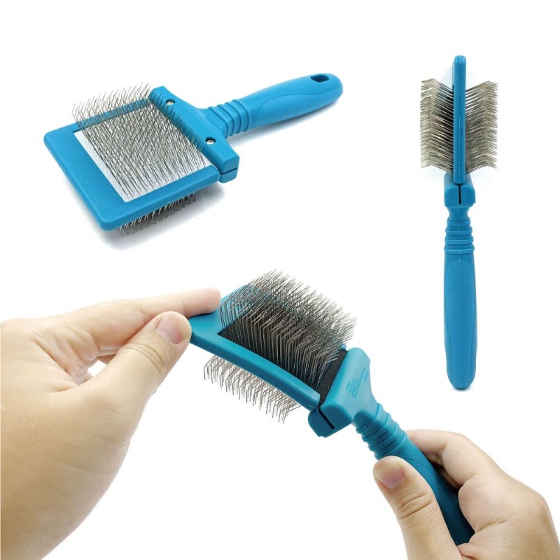 主要是針對雙層濃厚毛髮貓狗使用。 針長的設(shè)計能夠比一般針梳更能深入毛髮底部,將深藏在底部的廢毛帶出,並能將底部的打結(jié)拆除。 其一面硬針,一面軟針的獨(dú)特設(shè)計更適用在洗完澡後的吹乾拆結(jié)用(硬針),以及平常的順毛梳理與梳蓬使用(軟針)。 雙面的針墊中間有一塊軟硬適中的鋼板,主要的功能是在梳理時,因鋼板本身的彈性,可以舒緩拉扯, 以減少斷毛的狀況以及減輕寵物在被梳理時的不適感。 針墊的左右兩側(cè)有塑膠套,主要是為了防止針墊在長期使用後會發(fā)生脫落的狀況。 手柄的前端處裝有止滑作用的橡膠圈,以避免在使用時滑落。