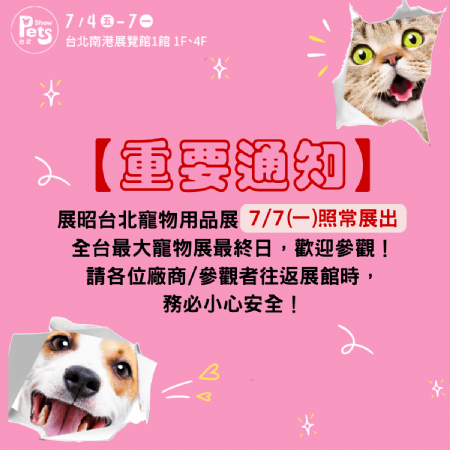 【展覽公告】7/7照常展出,全臺最大寵物展最終日,歡迎參觀!!!