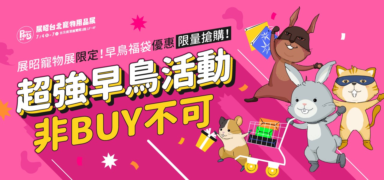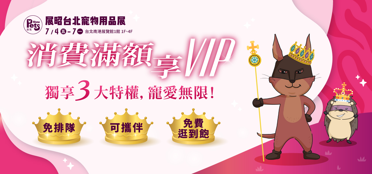 逛展小貼士 年度話題總動員,品牌新品齊登場!一次賞握寵物產(chǎn)業(yè)最新亮點! 展昭臺北寵物用品展集結(jié)全臺寵物品牌焦點、精選年度新品、展場首曝與全臺唯一,讓你一次看遍、一次買夠! 別錯過年度寵物新品的最大曝光場! 寵物新品情報網(wǎng) 展昭臺北寵物用品展限定!精選多間廠商展期限定早鳥活動,非buy不可! 多款早鳥福袋優(yōu)惠價,每日限量,絕對讓你買到賺到! 超強早鳥活動 全臺最大規(guī)模的展昭寵物用品展,超過2,100個知名品牌齊聚一堂,任你盡情選購?? 無論是健康主食、時尚穿搭、居家舒適好物,還是外出必備配件,通通一應(yīng)俱全,還有超值優(yōu)惠等你搶???? ??聰明選購不傷荷包,陪毛孩一起開啟夢幻購物之旅,輕鬆征服寵宇宙! 這樣BUY(敗)最省 不想錯過展場重點?我們都幫你整理好了! ?? 寵物展逛展懶人包大公開 ?? 展期限定活動、限時優(yōu)惠、品牌亮點一次掌握! 超值折扣不手軟、人氣品牌全到齊,還有現(xiàn)場驚喜活動等你來發(fā)現(xiàn)~ 毛爸毛媽快收藏,一起輕鬆逛展、滿載而歸! 逛展攻略 全齡毛孩保健室,關(guān)心毛孩健康大小事! 大會貼心網(wǎng)羅眾多參展商之保健食品,依照毛孩的日常保健需求細心分類 讓毛爸媽們能夠輕鬆找到適合的產(chǎn)品,給毛孩最貼心的呵護。 全齡毛孩保健室 全臺最大展昭寵物用品展,規(guī)模最大、最專業(yè),帶領(lǐng)寵物產(chǎn)業(yè)登陸寵宇宙! 大會推出最尊榮、最霸氣的「VIP特權(quán)」回饋給最支持展昭寵物展的朋友,凡當(dāng)日於展場消費滿2萬元者,即可成為展昭寵物VIP!擁有VIP特權(quán)的朋友可在展昭寵物系列展暢行無阻,享受展昭寵物展獨家VIP禮遇! 消費滿額享VIP